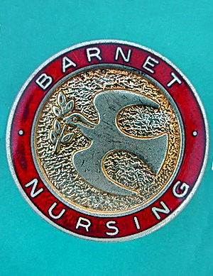 ..... Short Description ...... The Barnet Nursing Hospital badge was awarded to nurses on completion of training. It is (shape) in shape and made from (materials), with the hospital name around the circumference. The badge weighs (weight) grams and has a (rear pin/button hole) fixing. Picture: The central design is of (description). Badges (were/were not) named and dated with the name of the recipient on the reverse. ..... |