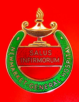 ..... Short Description ...... The Newmarket General Hospital Hospital badge was awarded to nurses on completion of training. It is (shape) in shape and made from (materials), with the hospital name around the circumference. The badge weighs (weight) grams and has a (rear pin/button hole) fixing. Picture: The central design is of (description). Badges (were/were not) named and dated with the name of the recipient on the reverse. ..... |