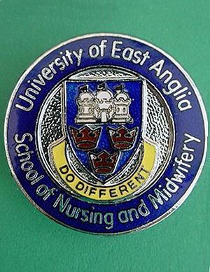 ..... Short Description ...... The University of East Anglia School of Nursing and Midwifery Norwich Hospital badge was awarded to nurses on completion of training. It is (shape) in shape and made from (materials), with the hospital name around the circumference. The badge weighs (weight) grams and has a (rear pin/button hole) fixing. Picture: The central design is of (description). Badges (were/were not) named and dated with the name of the recipient on the reverse. ..... |