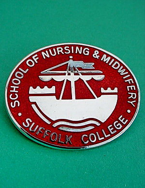 ..... Short Description ...... The School of nursing & Midwifery Suffolk College Hospital badge was awarded to nurses on completion of training. It is (shape) in shape and made from (materials), with the hospital name around the circumference. The badge weighs (weight) grams and has a (rear pin/button hole) fixing. Picture: The central design is of (description). Badges (were/were not) named and dated with the name of the recipient on the reverse. ..... |