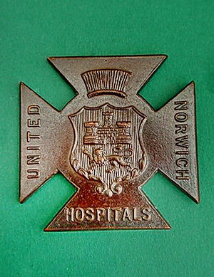 ..... Short Description ...... The United Norwich Hospitals Hospital badge was awarded to nurses on completion of training. It is (shape) in shape and made from (materials), with the hospital name around the circumference. The badge weighs (weight) grams and has a (rear pin/button hole) fixing. Picture: The central design is of (description). Badges (were/were not) named and dated with the name of the recipient on the reverse. ..... |