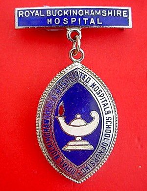 ..... Short Description ...... The Royal Buckinghamshire Associated Hospitals School of Nursing, Aylsbury Hospital badge was awarded to nurses on completion of training. It is (shape) in shape and made from (materials), with the hospital name around the circumference. The badge weighs (weight) grams and has a (rear pin/button hole) fixing. Picture: The central design is of (description). Badges (were/were not) named and dated with the name of the recipient on the reverse. ..... |