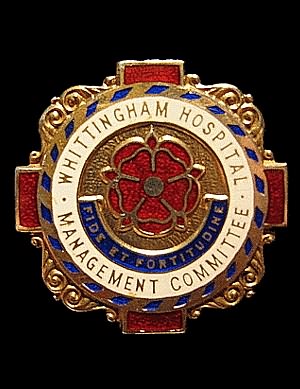 ..... Short Description ...... The Whittingham Hospital Management Committee, Preston, Hospital badge was awarded to nurses on completion of training. It is (shape) in shape and made from (materials), with the hospital name around the circumference. The badge weighs (weight) grams and has a (rear pin/button hole) fixing. Picture: The central design is of (description). Badges (were/were not) named and dated with the name of the recipient on the reverse. ..... |