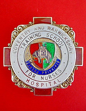 ..... Short Description ...... The Coventry and Warwickshire Hospital Training School for Nurses Hospital badge was awarded to nurses on completion of training. It is (shape) in shape and made from (materials), with the hospital name around the circumference. The badge weighs (weight) grams and has a (rear pin/button hole) fixing. Picture: The central design is of (description). Badges (were/were not) named and dated with the name of the recipient on the reverse. ..... |