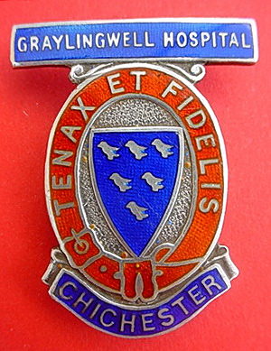 ..... Short Description ...... The Graylingwell Hospital Chichester Hospital badge was awarded to nurses on completion of training. It is (shape) in shape and made from (materials), with the hospital name around the circumference. The badge weighs (weight) grams and has a (rear pin/button hole) fixing. Picture: The central design is of (description). Badges (were/were not) named and dated with the name of the recipient on the reverse. ..... |