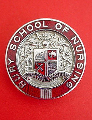 ..... Short Description ...... The Bury School of Nursing Hospital badge was awarded to nurses on completion of training. It is (shape) in shape and made from (materials), with the hospital name around the circumference. The badge weighs (weight) grams and has a (rear pin/button hole) fixing. Picture: The central design is of (description). Badges (were/were not) named and dated with the name of the recipient on the reverse. ..... |