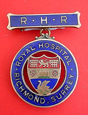 ..... Short Description ...... The Royal Hospital Richmond Hospital badge was awarded to nurses on completion of training. It is (shape) in shape and made from (materials), with the hospital name around the circumference. The badge weighs (weight) grams and has a (rear pin/button hole) fixing. Picture: The central design is of (description). Badges (were/were not) named and dated with the name of the recipient on the reverse. ..... |