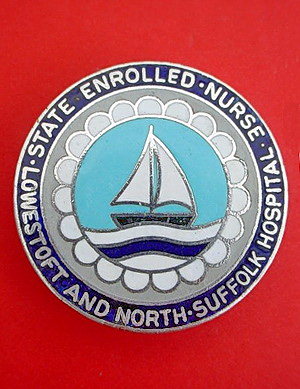 ..... Short Description ...... The Lowestoft and North Suffolk Hospital State Enrolled Nurse Hospital badge was awarded to nurses on completion of training. It is (shape) in shape and made from (materials), with the hospital name around the circumference. The badge weighs (weight) grams and has a (rear pin/button hole) fixing. Picture: The central design is of (description). Badges (were/were not) named and dated with the name of the recipient on the reverse. ..... |