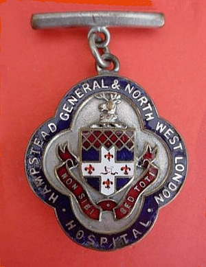 ..... Short Description ...... The Hampstead General & North West Hospital, London, Hospital badge was awarded to nurses on completion of training. It is (shape) in shape and made from (materials), with the hospital name around the circumference. The badge weighs (weight) grams and has a (rear pin/button hole) fixing. Picture: The central design is of (description). Badges (were/were not) named and dated with the name of the recipient on the reverse. ..... |