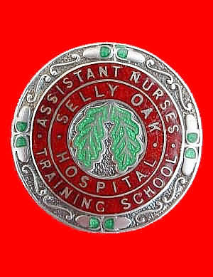 ..... Short Description ...... The Assistant Nurse Training School Selly Oak Hospital Hospital badge was awarded to nurses on completion of training. It is (shape) in shape and made from (materials), with the hospital name around the circumference. The badge weighs (weight) grams and has a (rear pin/button hole) fixing. Picture: The central design is of (description). Badges (were/were not) named and dated with the name of the recipient on the reverse. ..... |
