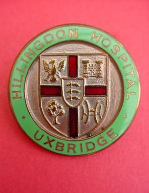 It is (shape) in shape and made from (materials), with the hospital name around the circumference.