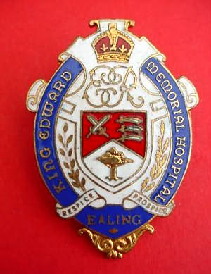 ..... Short Description ...... The King Edward Memorial Hospital Ealing, Hospital badge was awarded to nurses on completion of training. It is (shape) in shape and made from (materials), with the hospital name around the circumference. The badge weighs (weight) grams and has a (rear pin/button hole) fixing. Picture: The central design is of (description). Badges (were/were not) named and dated with the name of the recipient on the reverse. ..... |