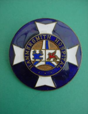 ..... Short Description ...... The Hammersmith Hospital Acton, Hospital badge was awarded to nurses on completion of training. It is (shape) in shape and made from (materials), with the hospital name around the circumference. The badge weighs (weight) grams and has a (rear pin/button hole) fixing. Picture: The central design is of (description). Badges (were/were not) named and dated with the name of the recipient on the reverse. ..... |
