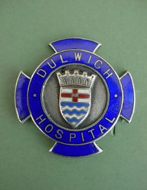 ..... Short Description ...... The Dulwich Hospital London Hospital badge was awarded to nurses on completion of training. It is (shape) in shape and made from (materials), with the hospital name around the circumference. The badge weighs (weight) grams and has a (rear pin/button hole) fixing. Picture: The central design is of (description). Badges (were/were not) named and dated with the name of the recipient on the reverse. ..... |