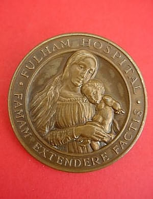 It is (shape) in shape and made from (materials), with the hospital name around the circumference.