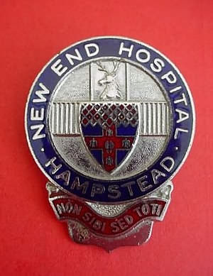 ..... Short Description ...... The New End Hospital Hampstead Hospital badge was awarded to nurses on completion of training. It is (shape) in shape and made from (materials), with the hospital name around the circumference. The badge weighs (weight) grams and has a (rear pin/button hole) fixing. Picture: The central design is of (description). Badges (were/were not) named and dated with the name of the recipient on the reverse. ..... |