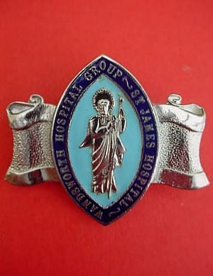 ..... Short Description ...... The St James Hospital, Balham, Hospital badge was awarded to nurses on completion of training. It is (shape) in shape and made from (materials), with the hospital name around the circumference. The badge weighs (weight) grams and has a (rear pin/button hole) fixing. Picture: The central design is of (description). Badges (were/were not) named and dated with the name of the recipient on the reverse. ..... |
