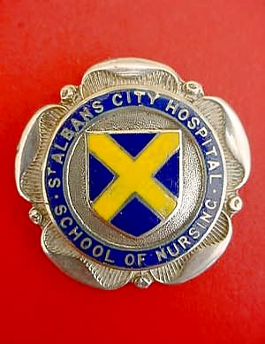 ..... Short Description ...... The St Albans City Hospital School of Nursing Hospital badge was awarded to nurses on completion of training. It is (shape) in shape and made from (materials), with the hospital name around the circumference. The badge weighs (weight) grams and has a (rear pin/button hole) fixing. Picture: The central design is of (description). Badges (were/were not) named and dated with the name of the recipient on the reverse. ..... |