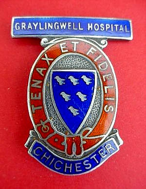 ..... Short Description ...... The Graylingwell Hospital Chichester Hospital badge was awarded to nurses on completion of training. It is (shape) in shape and made from (materials), with the hospital name around the circumference. The badge weighs (weight) grams and has a (rear pin/button hole) fixing. Picture: The central design is of (description). Badges (were/were not) named and dated with the name of the recipient on the reverse. ..... |