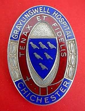 ..... Short Description ...... The Grayingwell Hospital Chichester Hospital badge was awarded to nurses on completion of training. It is (shape) in shape and made from (materials), with the hospital name around the circumference. The badge weighs (weight) grams and has a (rear pin/button hole) fixing. Picture: The central design is of (description). Badges (were/were not) named and dated with the name of the recipient on the reverse. ..... |