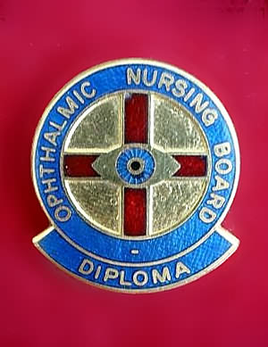 ..... Short Description ...... The Ophthalmic Nursing Board Diploma Hospital badge was awarded to nurses on completion of training. It is (shape) in shape and made from (materials), with the hospital name around the circumference. The badge weighs (weight) grams and has a (rear pin/button hole) fixing. Picture: The central design is of (description). Badges (were/were not) named and dated with the name of the recipient on the reverse. ..... |