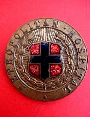 ..... Short Description ...... The Metropolitan Hospital London, Hospital badge was awarded to nurses on completion of training. It is (shape) in shape and made from (materials), with the hospital name around the circumference. The badge weighs (weight) grams and has a (rear pin/button hole) fixing. Picture: The central design is of (description). Badges (were/were not) named and dated with the name of the recipient on the reverse. ..... |