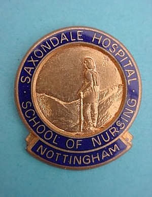 ..... Short Description ...... The Saxondale Hospital School of Nursing, Nottingham, Hospital badge was awarded to nurses on completion of training. It is (shape) in shape and made from (materials), with the hospital name around the circumference. The badge weighs (weight) grams and has a (rear pin/button hole) fixing. Picture: The central design is of (description). Badges (were/were not) named and dated with the name of the recipient on the reverse. ..... |