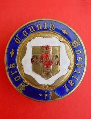 ..... Short Description ...... The York County Hospital Yorkshire Hospital badge was awarded to nurses on completion of training. It is (shape) in shape and made from (materials), with the hospital name around the circumference. The badge weighs (weight) grams and has a (rear pin/button hole) fixing. Picture: The central design is of (description). Badges (were/were not) named and dated with the name of the recipient on the reverse. ..... |