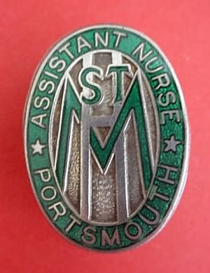 ..... Short Description ...... The Assist Nurse Portsmouth Hospital badge was awarded to nurses on completion of training. It is (shape) in shape and made from (materials), with the hospital name around the circumference. The badge weighs (weight) grams and has a (rear pin/button hole) fixing. Picture: The central design is of (description). Badges (were/were not) named and dated with the name of the recipient on the reverse. ..... |