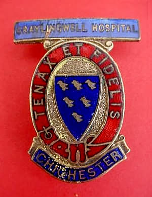 ..... Short Description ...... The Graylingwell Hospital Chichester Hospital badge was awarded to nurses on completion of training. It is (shape) in shape and made from (materials), with the hospital name around the circumference. The badge weighs (weight) grams and has a (rear pin/button hole) fixing. Picture: The central design is of (description). Badges (were/were not) named and dated with the name of the recipient on the reverse. ..... |