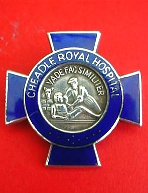 ..... Short Description ...... The Cheadle Royal Hospital Hospital badge was awarded to nurses on completion of training. It is (shape) in shape and made from (materials), with the hospital name around the circumference. The badge weighs (weight) grams and has a (rear pin/button hole) fixing. Picture: The central design is of (description). Badges (were/were not) named and dated with the name of the recipient on the reverse. ..... |