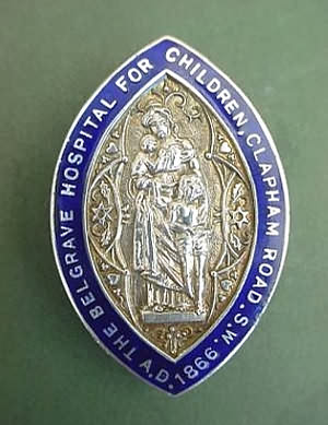 ..... Short Description ...... The Belgrave Hospital for Children, Clapham Road, Hospital badge was awarded to nurses on completion of training. It is (shape) in shape and made from (materials), with the hospital name around the circumference. The badge weighs (weight) grams and has a (rear pin/button hole) fixing. Picture: The central design is of (description). Badges (were/were not) named and dated with the name of the recipient on the reverse. ..... |