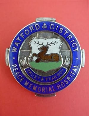 ..... Short Description ...... The Watford & District Peace Memorial Hospital Hospital badge was awarded to nurses on completion of training. It is (shape) in shape and made from (materials), with the hospital name around the circumference. The badge weighs (weight) grams and has a (rear pin/button hole) fixing. Picture: The central design is of (description). Badges (were/were not) named and dated with the name of the recipient on the reverse. ..... |