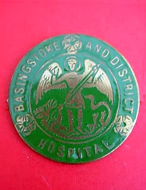 ..... Short Description ...... The Basingstoke and District Hospital Hospital badge was awarded to nurses on completion of training. It is (shape) in shape and made from (materials), with the hospital name around the circumference. The badge weighs (weight) grams and has a (rear pin/button hole) fixing. Picture: The central design is of (description). Badges (were/were not) named and dated with the name of the recipient on the reverse. ..... |