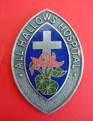 ..... Short Description ...... The All Hallows Hospital Ditchingham Hospital badge was awarded to nurses on completion of training. It is (shape) in shape and made from (materials), with the hospital name around the circumference. The badge weighs (weight) grams and has a (rear pin/button hole) fixing. Picture: The central design is of (description). Badges (were/were not) named and dated with the name of the recipient on the reverse. ..... |