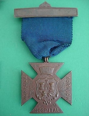 ..... Short Description ...... The Norfolk and Norwich Hospital, Norwich, Hospital badge was awarded to nurses on completion of training. It is (shape) in shape and made from (materials), with the hospital name around the circumference. The badge weighs (weight) grams and has a (rear pin/button hole) fixing. Picture: The central design is of (description). Badges (were/were not) named and dated with the name of the recipient on the reverse. ..... |