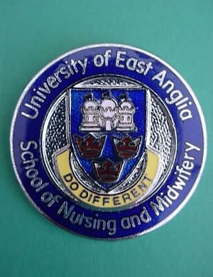 ..... Short Description ...... The University of East Anglia School of Nursing and Midwifery, Norwich, Hospital badge was awarded to nurses on completion of training. It is (shape) in shape and made from (materials), with the hospital name around the circumference. The badge weighs (weight) grams and has a (rear pin/button hole) fixing. Picture: The central design is of (description). Badges (were/were not) named and dated with the name of the recipient on the reverse. ..... |