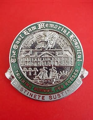 ..... Short Description ...... The (Name/Place) Hospital badge was awarded to nurses on completion of training. It is (shape) in shape and made from (materials), with the hospital name around the circumference. The badge weighs (weight) grams and has a (rear pin/button hole) fixing. Picture: The central design is of (description). Badges (were/were not) named and dated with the name of the recipient on the reverse. ..... |