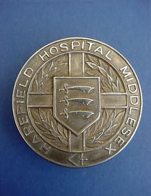 ..... Short Description ...... The Harefield Hospital Hillingdon, Hospital badge was awarded to nurses on completion of training. It is (shape) in shape and made from (materials), with the hospital name around the circumference. The badge weighs (weight) grams and has a (rear pin/button hole) fixing. Picture: The central design is of (description). Badges (were/were not) named and dated with the name of the recipient on the reverse. ..... |