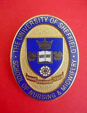 ..... Short Description ...... The University of Sheffield School of Nursing & Midwifery Hospital badge was awarded to nurses on completion of training. It is (shape) in shape and made from (materials), with the hospital name around the circumference. The badge weighs (weight) grams and has a (rear pin/button hole) fixing. Picture: The central design is of (description). Badges (were/were not) named and dated with the name of the recipient on the reverse. ..... |