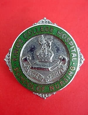..... Short Description ...... The Kings College Hospital School of Nursing, London, Hospital badge was awarded to nurses on completion of training. It is (shape) in shape and made from (materials), with the hospital name around the circumference. The badge weighs (weight) grams and has a (rear pin/button hole) fixing. Picture: The central design is of (description). Badges (were/were not) named and dated with the name of the recipient on the reverse. ..... |