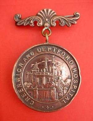 ..... Short Description ...... The Greenwich and Deptford Hospital London Hospital badge was awarded to nurses on completion of training. It is (shape) in shape and made from (materials), with the hospital name around the circumference. The badge weighs (weight) grams and has a (rear pin/button hole) fixing. Picture: The central design is of (description). Badges (were/were not) named and dated with the name of the recipient on the reverse. ..... |