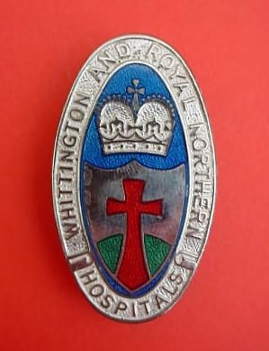 ..... Short Description ...... The Whittington and Royal Northern Hospitals London Hospital badge was awarded to nurses on completion of training. It is (shape) in shape and made from (materials), with the hospital name around the circumference. The badge weighs (weight) grams and has a (rear pin/button hole) fixing. Picture: The central design is of (description). Badges (were/were not) named and dated with the name of the recipient on the reverse. ..... |