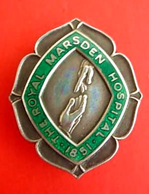 ..... Short Description ...... The Royal Marsden Hospital London Hospital badge was awarded to nurses on completion of training. It is (shape) in shape and made from (materials), with the hospital name around the circumference. The badge weighs (weight) grams and has a (rear pin/button hole) fixing. Picture: The central design is of (description). Badges (were/were not) named and dated with the name of the recipient on the reverse. ..... |