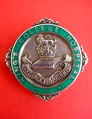 It is (shape) in shape and made from (materials), with the hospital name around the circumference.
