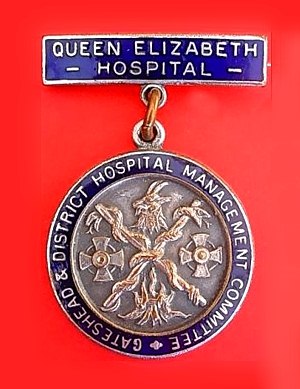 ..... Short Description ...... The Gateshead District HMC Queen Elizabeth Hospital Hospital badge was awarded to nurses on completion of training. It is (shape) in shape and made from (materials), with the hospital name around the circumference. The badge weighs (weight) grams and has a (rear pin/button hole) fixing. Picture: The central design is of (description). Badges (were/were not) named and dated with the name of the recipient on the reverse. ..... |