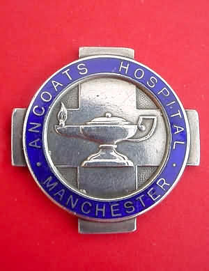 Short Description ...... The Ancoates Hospital Manchester Hospital badge was awarded to nurses on completion of training. It is a crossed circle in shape and made from (materials), with the hospital name around the circumference. The badge weighs (weight) grams and has a (rear pin/button hole) fixing. Picture: The central design is of (description). Badges (were/were not) named and dated with the name of the recipient on the reverse. |