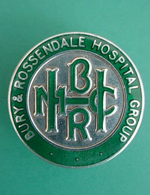 Short Description ...... The Bury & Rossendale Hospital Group Hospital badge was awarded to nurses on completion (Length) of training. It is circular in shape and made from (materials). The badge weighs (weight) grams and has a (rear pin/button hole) fixing. Picture: The central design is of a circle with the group logo in lettering in the centre and the name of the group around the outer circumference outlined by green enamel. Badges (were/were not) named and dated with the name of the recipient on the reverse. |