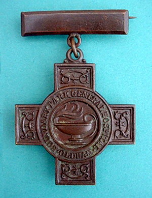 Short Description ...... The Boundary Park General Hospital Oldham Hospital badge was awarded to nurses on completion of training. It is a square cruciform shape with a central circular area with a looped suspension bar above. It is made from bronze metal. The badge weighs (weight) grams and has the top looped suspension bar fixing. Picture: The central circular design contains the name of the hospital around the circumference with the central lamp and embellished cross arms cast in relief. Badges (were/were not) named and dated with the name of the recipient on the reverse. |