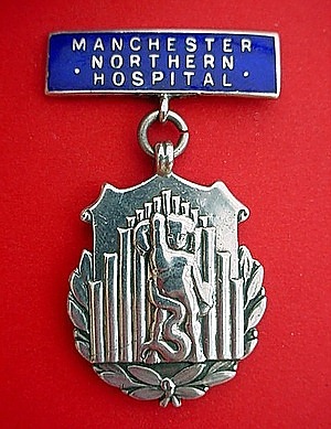 Short Description ...... The Manchester Northern Hospital Hospital badge was awarded to nurses on completion of training. It is a heart shaped looped suspension bar above and is made from (materials). The hospital name is on the suspension bar. The badge weighs (weight) grams and has a (rear pin/button hole) fixing. Picture: The central design is in silver with the named suspension bar outlined in blue enamel. (description). Badges (were/were not) named and dated with the name of the recipient on the reverse. |
